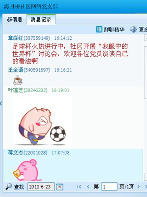 南非世界杯正在火热进行中,在球赛转播的同时,社区党支部的QQ群也不停的闪烁着,大家争论个不停,党员间发起了“我眼中的世界杯”活动。大家在“网上家园”畅所欲言,在群共享里发“喜爱明星照片”、在公告栏定期更新每日球赛,俨然一个Q式球迷俱乐部。