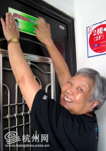 郦幼凤开心得把低碳家庭示范户的的标牌挂在自家的门上。