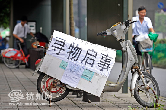 杭州网讯 上塘路潮王路口,有个公共自行车租赁站点,站名叫“上塘路工大西”。车棚旁边停着一辆电动车,车身上挂着一大块泡沫板,上面写着大大的“寻物启示”四个字,内容是6月28日在此站点将一个纸箱遗忘在公共自行车篮里,并承诺2000元酬金。