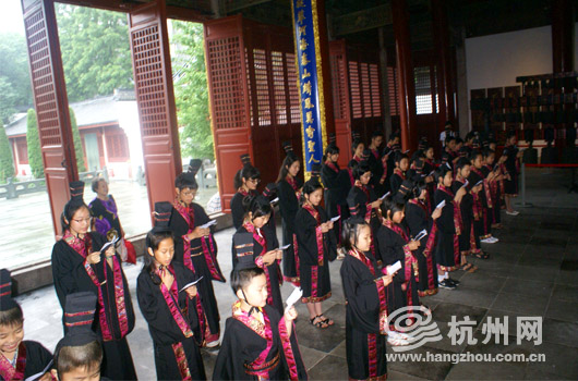 杭州网讯 “人之初,性本善。性相近,习相远。苟不教,性乃迁……”7月14日,杭州孔庙里传来了一阵阵稚嫩而洪亮的琅琅读书声,使炎热夏季的烦躁心情顿时平静下来。一群孩子身着汉服在宽敞、古朴的大厅里,体会着国学的内涵与精髓。