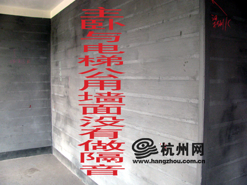 在7幢的2单元,电梯和卧室是共用一堵墙面,根据建筑规范和强制规定,卧室、客厅和电梯共用一面墙的,要做隔音处理,或者加隔音墙。而整个单元电梯井都没有加隔音墙。
