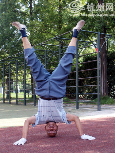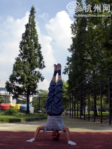 年轻小伙玩倒立不足为奇,但81岁的老人玩倒立,你肯怕还没见过吧?记者在浙工大体育场就见到了这一幕,81岁老人也玩起倒立。