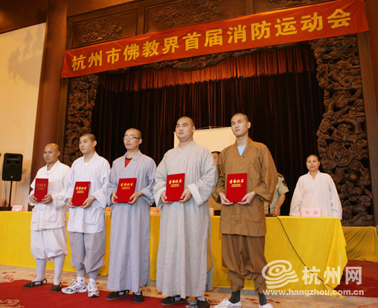 为了全面提高寺院检查消除火灾隐患能力、组织扑救初期火灾能力、组织人员疏散逃生能力和消防宣传教育培训能力,今天上午,“杭州市佛教界首届消防运动会”在灵隐寺拉开帷幕,来自11家市属寺院、佛学院的60名运动员分别参加了各个项目的比赛。开幕式由市民宗局副局长吴建华主持,省消防总队副总队长曹瑞明、市民宗局局长钮俊、市佛协会长光泉法师分别在开幕式上致辞。