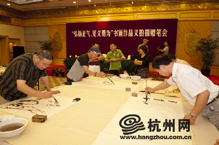 为响应杭州市见义勇为基金会、杭州市文明办、杭州市公安局、杭州市文联等单位发起的首届“弘扬正气、见义勇为”书画作品义拍活动,40位著名书(画)家齐聚新侨饭店,当场挥毫泼墨,共创作了87幅书画作品,无偿捐赠给市见义勇为基金会。