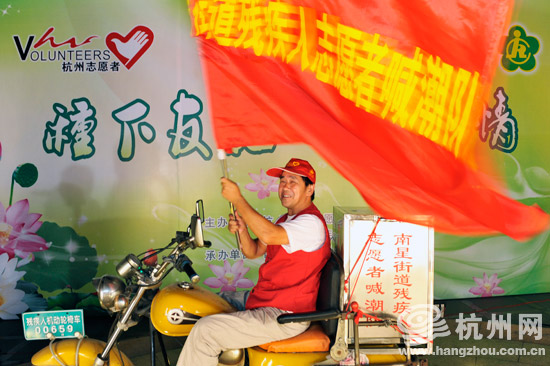 新队旗鼓舞着残疾人朋友把喊潮救人这项志愿服务继续进行下去。