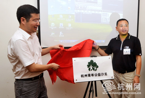 团市委副书记赖明诚和杭州民间公益组织负责人代表郑壹零为“杭州青年公益沙龙”揭牌