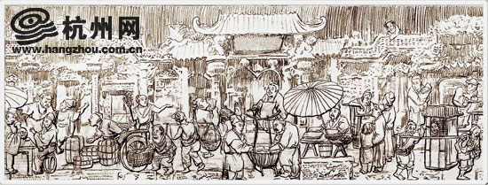 东河菜市桥下西侧的《菜市桥市井主图》浮雕,以组图的形式描述古菜市桥市井生活百态。