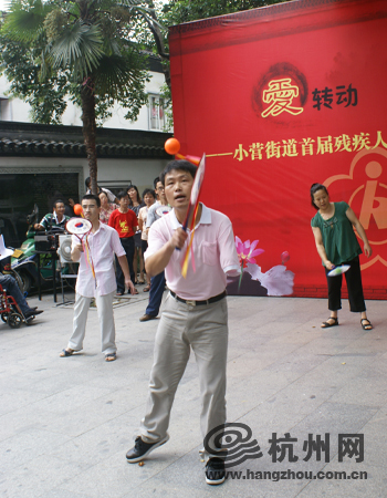 今天上午在小营巷社区,一台别开生面的文艺演出隆重上演,坐在轮椅上的轮椅操,考验平衡和协调能力的柔力球表演,都博得了社区居民的阵阵掌声。柔力球队的领队来金民是小营街道肢残人分会的会员,他带领的队伍在杭州只有两支,“玩这个就像是打太极,要讲究平衡,还能放松心情。”就在正常人玩起来都颇为费力的柔力球,在肢残的来金民手里却是服服帖帖。