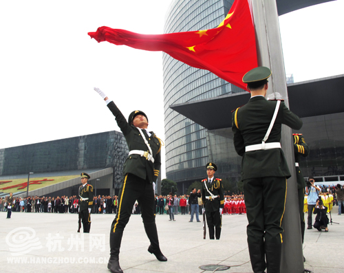 杭州网讯 10月1日早晨8点,杭州市国庆节升国旗仪式在钱江新城市民中心广场上隆重举行,在中华人民共和国成立61周年的喜庆日子,向伟大祖国献上最美好的祝福,深情表达我们对党、对祖国的无限忠诚与热爱。