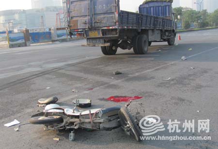 杭州网记者核实报道:骑电动车的是一位50岁左右的男性,姓高。早上6点50分左右,高师傅骑电动车沿庆春路自西向东行驶,过钱江路十字路口时,与一辆由三堡开往汽车南站方向去的大货车发生相撞。