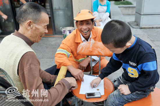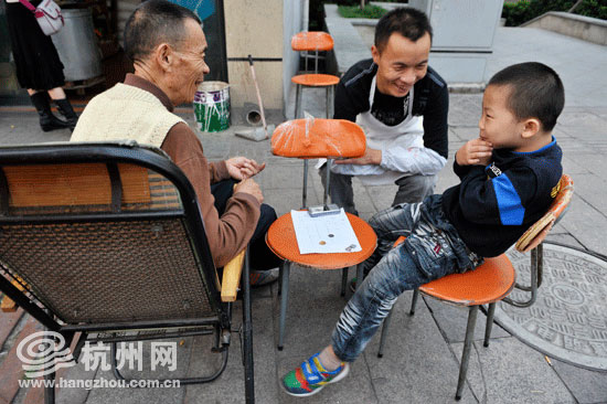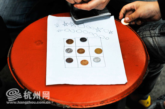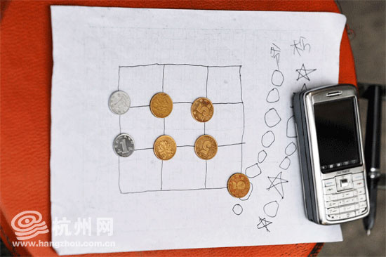 杭州网讯 下午5点多,文晖路星都宾馆旁的马路边,一对祖孙在下棋,棋子分别是一角和五角硬币,棋盘是一张作文纸,背面用铅笔画了个九宫格。