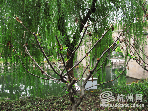 在董师傅的指引下,杭州网记者在万安桥和菜市桥之间的河段边,找到了这株“不听话的桃花“。