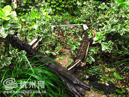 烧焦的窗棂掉落在楼下的花坛里。