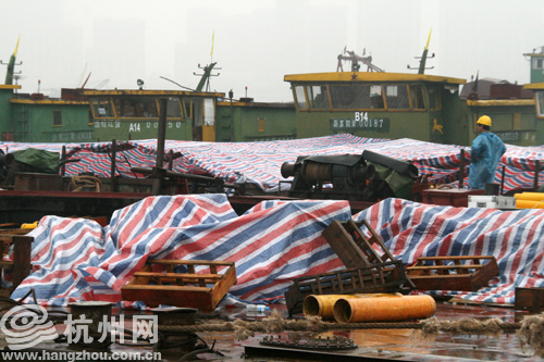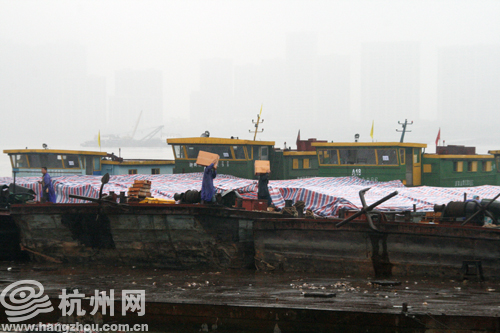 在钱塘江边的某码头,停靠着几十艘货船,船上船下,身穿蓝色制服的工人们在搬运着一个个大纸箱。据了解,这次烟花大会的全部烟花都将在这里进行安装,它们会被装到34艘货船上,每艘船最大能装330吨。