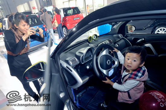 三岁的李嘉慧在“试驾”前段时间热卖的SMART。
