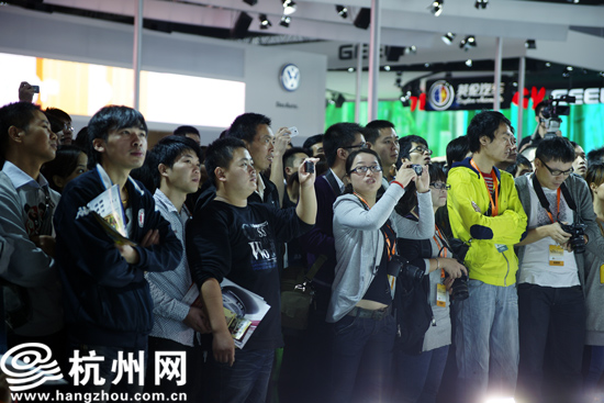 展台上的模特们用着各种造型来吸引游客