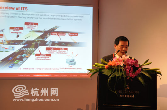 在这次论坛上,韩国水原市副市长芮昌根带来了水原市一套叫做ITS的智能交通系统。这套系统包括实时交通系统以及监测违章停车的监控系统等等。芮昌根说,在水原市,城市公共交通都会交给这个智能系统来管理。