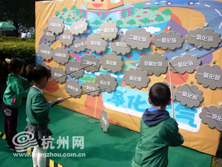 类似这样寓教于乐的环保游戏,在今天的活动现场共推出了17项。除了一直广受孩子们喜爱的“小小护林员”、“环保超人”、“净化空气”等游戏外,今年还增加了如“保护绿色杭州”、“运河小卫士”、“低碳西湖”等极具杭州特色的环保游戏,更增添了能进行高科技互动体验的“低碳王国”。