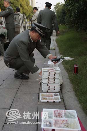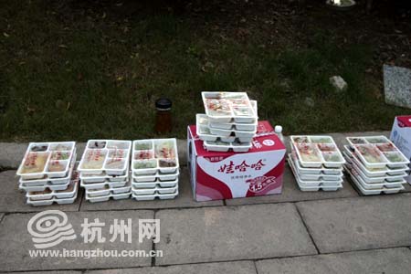 这是执法队员们的晚餐,队员告诉记者,本次烟花大会,市政府对交警、公安、城管等现场执法队员的晚餐全部指定专业供应点,确保食品安全。