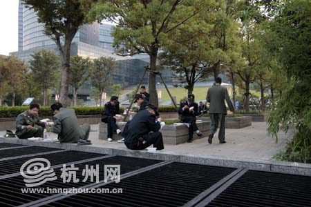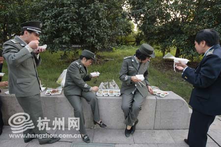 江干区采荷中队的这几名队员索性就在路边将就着解决了。