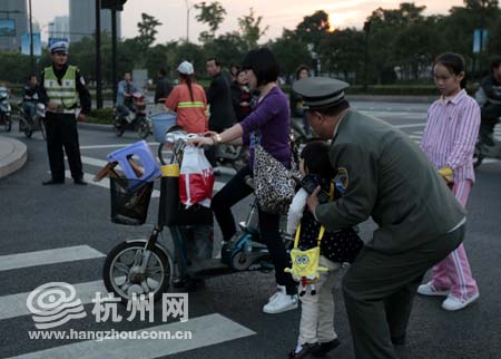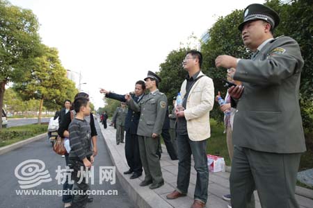 穿白色夹克的小伙子和女朋友来杭州旅游刚好遇到烟花大会,也想来凑热闹,可是人生地不熟,于是向执法队员求助。刚说着,又来一对问路的母子。