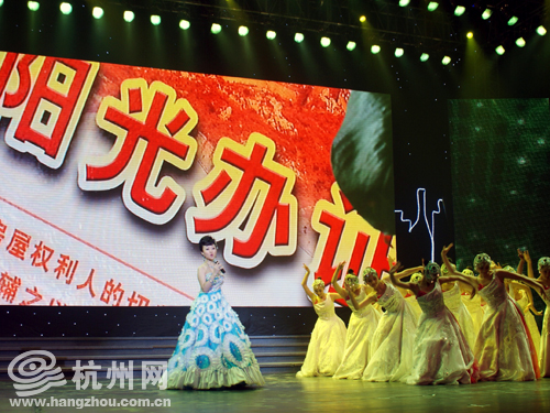 一位红衣舞者在电子屏幕的锣鼓上敲出的“阳光权利 服务人民”八个大字,点出了杭州行政服务中心和市民之家的宗旨,也拉开了庆祝晚会的序幕。