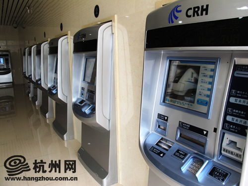 5、 在车站自动售票机上购票。杭州火车站二楼平台北面的“自助售票处”(原北售票厅)共设有24台自动售票机。