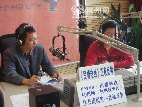 杭州网讯 由FM89《民情热线》和杭网议事厅联合推出的“区长谈民生——杭州食品安全”专题自推出以来,得到了网民和听众的广泛关注。今天早上,江干区委常委、副区长刘秋敏联合江干食品药品监管分局党委书记余晓钟、江干区卫生局副局长陈支农、江干工商分局副局长费坚、江干环保分局监察科副主任科员王勇、江干区城管执法局副局长顾友良等嘉宾,一起走进直播间,就市民关心的各种食品安全问题,做了现场解答。