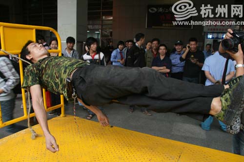 没错,就是明星要到来。3点整,“睡绳哥”果然出现,穿一件迷彩短袖上衣,黑色裤子,衣着虽普通,但前呼后拥,阵势大得很。除了媒体的记者,还有不少市民,都是专程来目睹“睡绳哥”的绝活的。