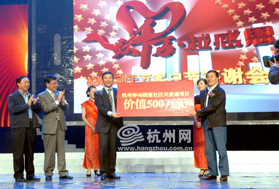 答谢会发布了中国移动杭州分公司成立以来第一份企业社会责任报告——《和谐共成长》。杭州移动牵手杭州市民政局,出资500万,援建“社区关爱通项目”,计划在半年内为杭州主城区的11个街道配备社区服务数字关爱平台,并且捐助专用老人手机一万台。