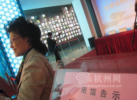 在闭馆告示贴出后,仍有依依不舍的游客在杭州馆前留影。
