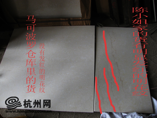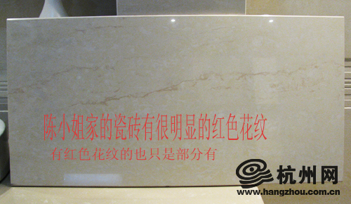 马可波罗的刘经理则说:“货没有任何质量问题,样品是今年3月份出炉的一批,而陈小姐家的砖是今年9月份出炉的一批,所以颜色是有一点色差,但和样品都是同一个型号的砖。只是同型号不同色号。”