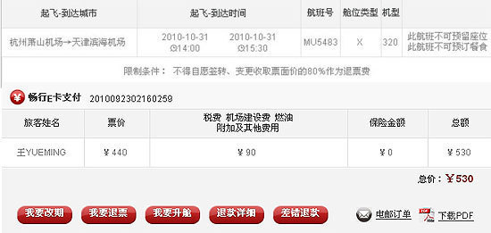 王先生将当日自己购买机票的网上订单发到了“杭网议事厅”,订单上显示王先生购买的机票为10月30日的MU5483航班,于当天14点从杭州萧山机场起飞,15:30到达天津滨海机场。单张票价440元,加上机场建设费等共计530元。