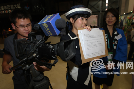 在采访结束的时候,按照惯例,我们希望馆长永井隆裕先生能够录一段杭州网十周年的祝福语,我和翻译沟通,因为考虑到馆长不会说中文,所以他可以用日文录一句。
