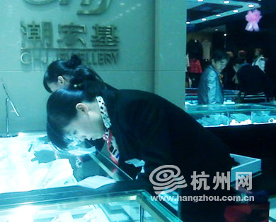 晚上8点,杭州网记者了解到,失窃的专柜是正对大门的某品牌珠宝专柜,面积大约有40来平方米,与旁边的黄金珠宝柜台相比,失窃的专柜算是最大的一个。