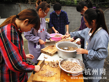 大家把各种食材切成小方块后均匀搅拌,弥漫的香气让狗狗们早已经坐不住了,阵阵犬吠如排山倒海般响起,猫咪也失去了一贯的高傲和矜持,开始急切地挠着铁栅栏。