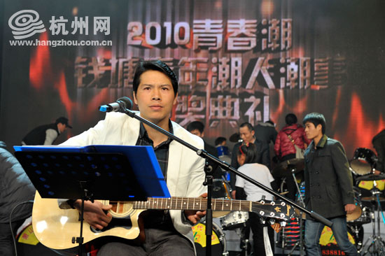 “音乐王子”缪朝红现场弹唱,他是来自萧山区所前镇缪家村的团支部书记。