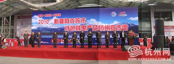 阿克苏市委副书记、市长穆塔里甫•肉孜宣布2010年度新疆阿克苏市特色林果产品杭州宣传周正式启动。阿克苏市委常委、宣传部长周传金, 杭州市政府副秘书长、杭州援疆指挥部指挥长谢建华分别致词。