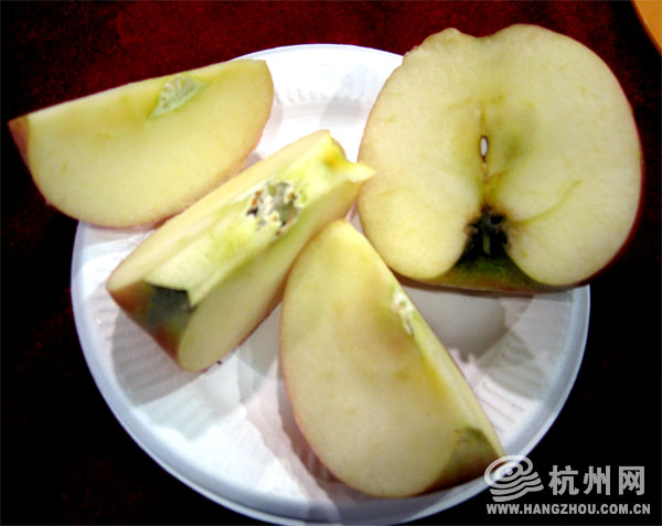 启动仪式结束后,记者也走访了一些摊位。“特级的冰糖心我们卖的是120元一箱,一箱11.6斤。如果是直径80毫米规格的,价格要便宜点,100元一箱。”新疆浙商爱心果品有限公司展位的工作人员告诉记者,“其实,是不是真的新疆冰糖心苹果比较好鉴别,只要把苹果对半切开,真正的冰糖心苹果,核里面也是长肉的。”说完,工作人员随手从箱子里拿出一个苹果,对半切开,可以看到连苹果核里的籽也被果肉包围。
