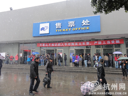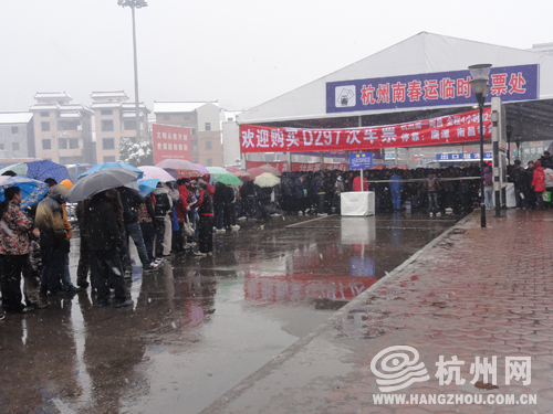 杭州南站广场上的两个临时售票厅,从1月9日就开始对外发售11天内的全国各地的车票。无论是售票大厅,还是临时售票点都是挤满了购票的人,每个售票点都有2-3000人在日夜排队。