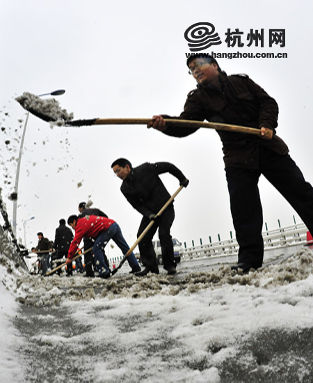 杭州交通公路部门增加投入抢险人员141人,出动杭州市公路局机关工作人员50余人到绕城高速公路扫雪,累计达1329人;增加投入工业盐190吨,24小时不间断用机器和人工向积雪路段撒盐,目前累计达300余吨;增加投入防滑料130立方米,累计达310立方米;增加投入草包5400只,累计达7500只;增加投入除雪机具和车辆7台,累计达188台。