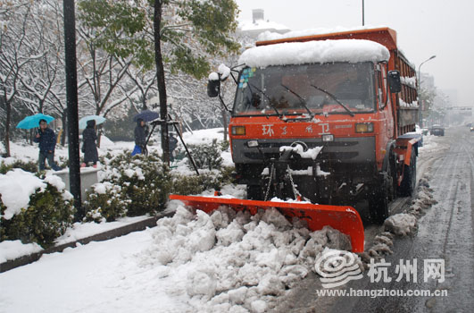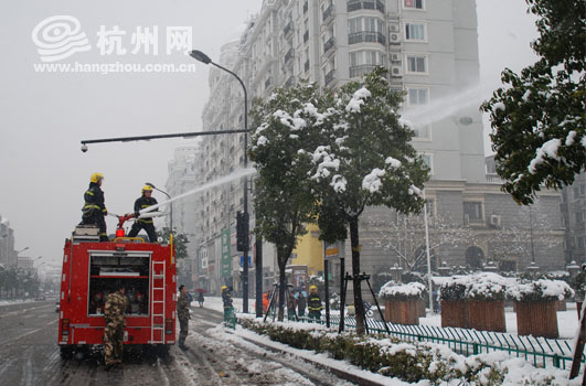杭州网讯 连日来的大雪异常气候,给杭城的居民群众出行带来诸多不便,特别是昨晚的一场大雪,使道路严重积雪,路面湿滑。早晨上班的人们骑车、步行在湿滑的路面,稍有不慎就会跌倒。西湖区各部门按照市委、市政府“四保”(保畅通、保安全、保供应、保绿化)的指示精神,全民动员奋力抗击暴雪灾害天气,全区环卫、市政部门组织多支突击队清除道路积雪,重点确保主要道路、医院、学校和省人民大会堂“两会”现场的积雪清理;同时,出动绿化养护工人300余人,利用洒水车的高压水枪和竹竿抗雪保绿,消防部门也抽调部分消防车参与到抗雪保绿战斗中。