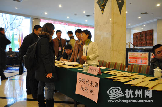 余杭代表团的陈建华,早上8点就从家里出来了,“还是关注民生的问题。”陈建华说,今年她会重点关注流动人口同城待遇以及生态型家庭建设方面的内容,“生态型家庭和节约型家庭建设直接关系着我们整个生态型城市建设。”