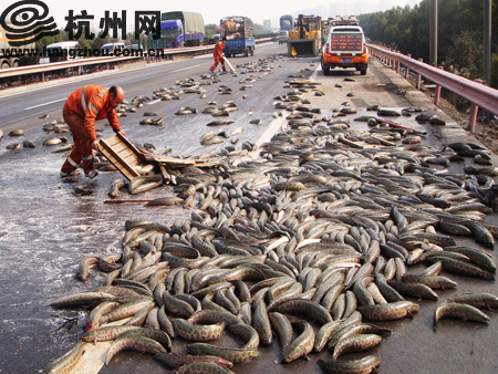 满地的黑鱼占据了一个车道