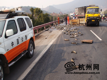 杭州网讯 1月24日12时28分,绕城二中队接到监控电话,绕城北线106K+600(右)路段有翻车事故,十分钟后路政队员赶赴现场,经现场勘察了解,是由于一辆面包车在超车道爆胎,后方一辆运送黑鱼的货车由于避让不及,导致翻车,坠入落差近3米的桥下。