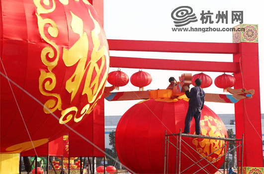 工人们在安装大灯笼