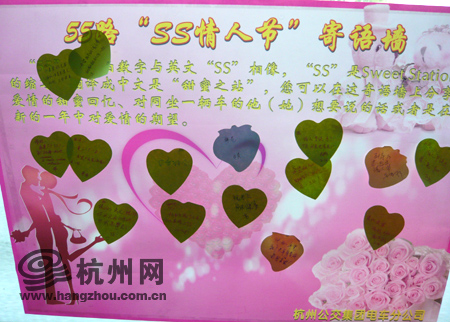 在精心装饰的“SS寄语墙”前坐了一对年轻的情侣,女的从男友手中接过玫瑰花,略带羞涩却满脸幸福,他们在纸上写下了“今生今世只爱你一个”的誓言,然后贴到了“寄语墙”上。