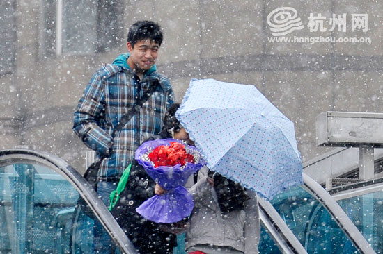 杭州网讯 很多人几天前就在期待一个浪漫的白色情人节,2月14日一早,杭州就飘起了漫天的雪花,让情侣们惊喜万分,当红玫瑰巧遇白雪花,让这个情人节显得尤其浪漫。