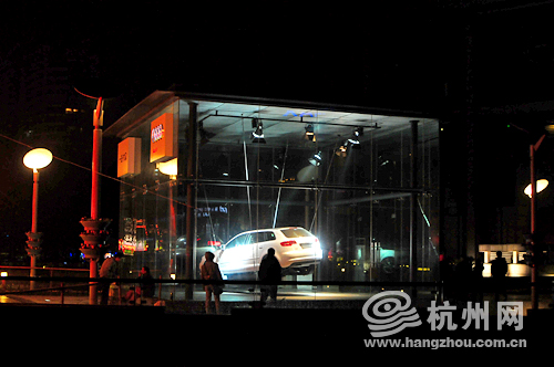 西湖文化广场,除了赏月、赏灯、赏烟花外,还有玻璃房内“飘着”的一辆靓车可看。