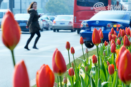 天目山路上,5000株从温室里培育出来的郁金香赶在正常花期前扮靓杭城。